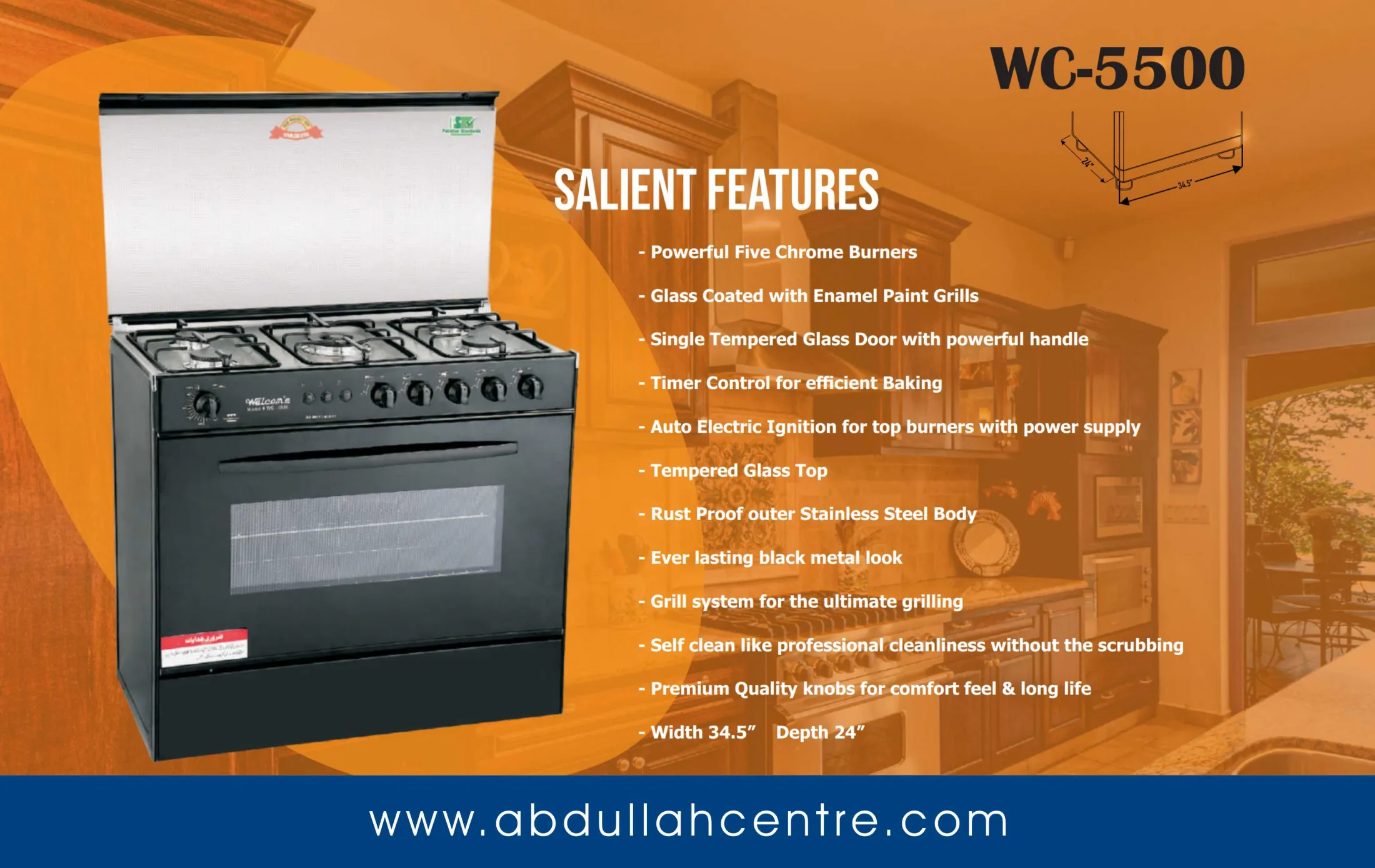 Get this multi-purpose stove range by Welcome Industries and enjoy delicious meals at home. Not only you can cook five dishes at a time but also bake your favorite cakes, cookies, lasagna and what you want. The light inside the oven lets you monitor your baking and prevent you from burning it. The gas oven makes baking much easier and convenient for you. With WC7500 ULTRA – Cooking Range, you can make delightfully yummy meals without any fear.